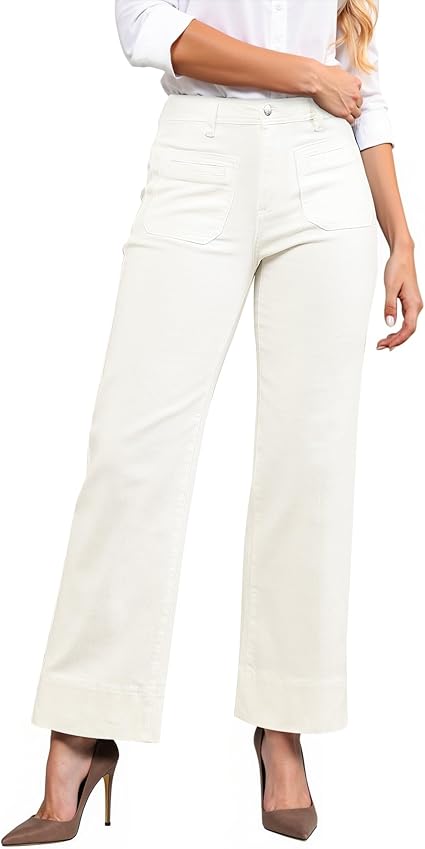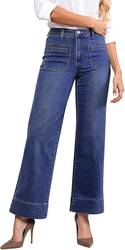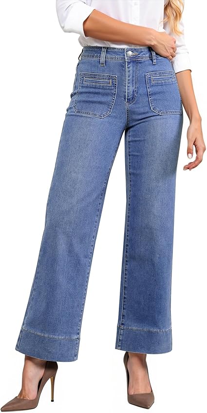 GRAPENT Wide Leg Jeans Woman Trendy High Waisted Patch Pocket Stretchy Denim Pants Vintage Casual Trouser Jeans