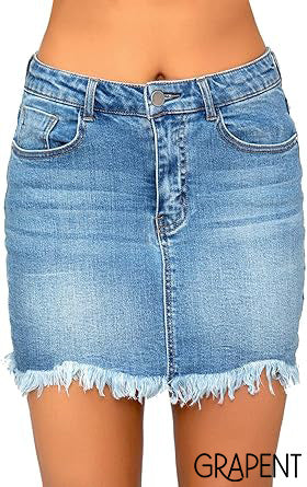 GRAPENT Women's Mid-Waist Ripped Denim Skirt Casual Fringed Hem Mini Skirt with Pockets