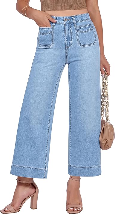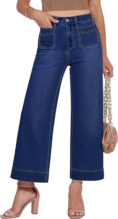 GRAPENT Cropped Jeans for Women Trendy 2026 Wide Leg High Waisted Patch Pocket Stretchy Denim Pants Short Trouser Jeans