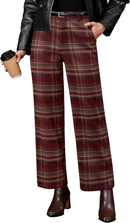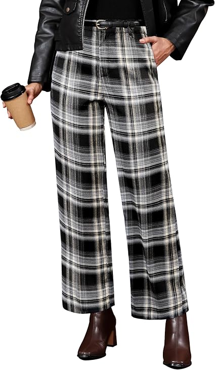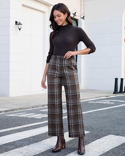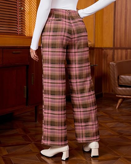 GRAPENT Plaid Pants for Women Wide Leg High Waisted Tartan Work Business Casual Elastic Waist Trousers Pants with Pocket